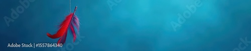 Fototapeta premium A single red and blue feather dangles from a thin string against a vibrant blue backdrop , light, hanging