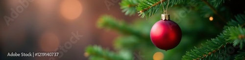 © anu, Fototapeta premium A single red bauble on a white string hangs from a branch of fir tree, red, fir