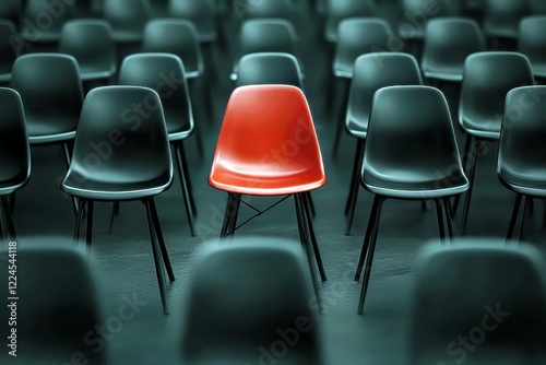 Naklejka premium A Single Red Chair Stands Out Amongst Rows of Black Chairs in a Minimalist Setting, Emphasizing Individuality and Isolation in Modern Design
