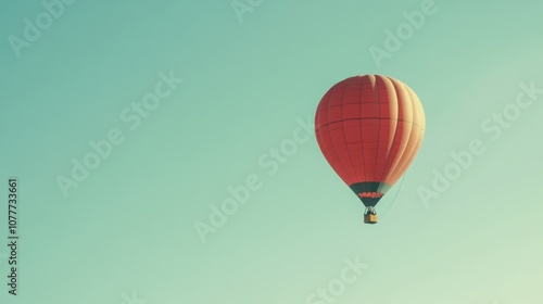 © Rahmat, Obraz premium A single red hot air balloon floats against a blue sky, with copy space.