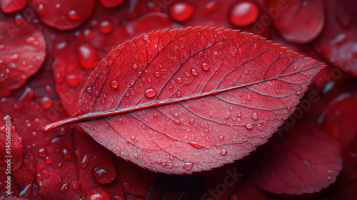 Fototapeta premium A single red leaf with prominent veins and water droplets, nestled among...