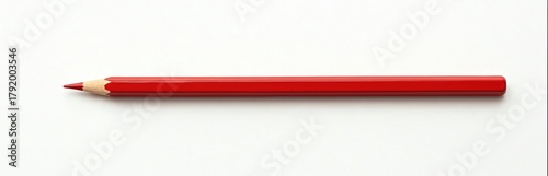 Fototapeta premium A single red pencil lies diagonally on a clean white background. Its tip is sharp, ready for drawing or writing. This simple object represents creativity, art, and education.