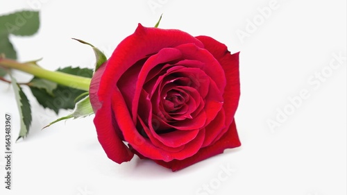 Fototapeta premium a single red rose on a long green stem on the left, surrounded by leaves. There is an empty white space on the right, creating a sense of elegance and simplicity.