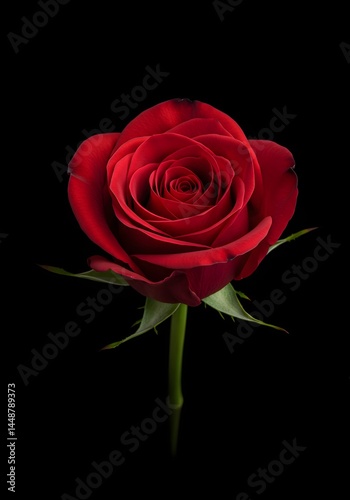 © Gambar, Naklejka premium A single red rose unveils its velvet petals against an abyss, symbolizing profound emotion and delicate beauty in a minimalist composition of nature's elegance