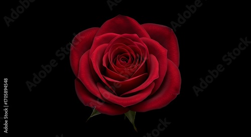 © Dilshan, Fototapeta premium A single red rose with dark green sepals is centered on a solid black background in a close up shot