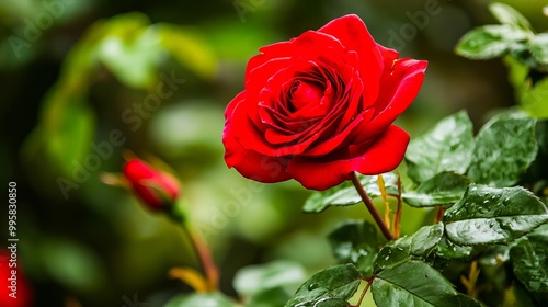 © VISUAL BACKGROUND, Naklejka premium A single red rose with green leaves in the background