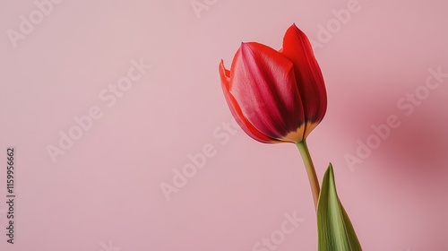 © ArpPSIqee, Fototapeta premium A single red tulip against a soft pastel pink background, side view shot, Romantic style