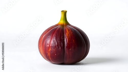© Dilshan, Fototapeta premium A single ripe fig with a short stem on a white background showing its ribbed texture and dark color