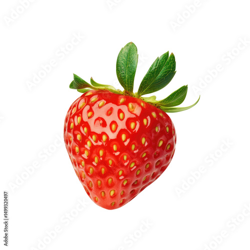© RomenaJannat, Obraz premium A single ripe red strawberry with green leaves isolated on a black background in a studio shot view