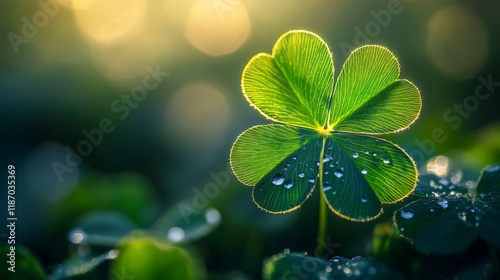 Naklejka premium A Single Shamrock Leaf Glistens In Morning Sunlight