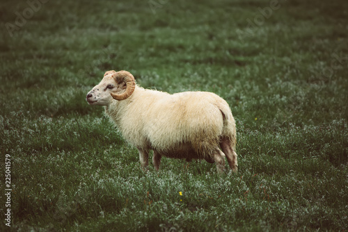 © Roxana, Obraz premium A single sheep grazing in a green grass meadow in Iceland