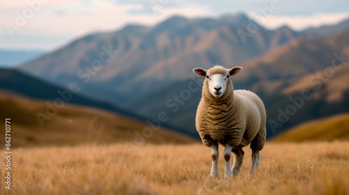 Fototapeta premium A single sheep walks through a field, with mountains in the background