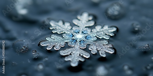 © A.Rod, Fototapeta premium A Single Snowflake Resting on a Surface of Water, Captured in Exquisite Detail, with a Delicate Reflection and a Blurred Background
