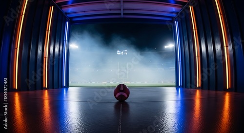 Fototapeta premium A single soccer ball sits on a wet floor in a dark tunnel leading out to a brightly lit stadium field with smoke