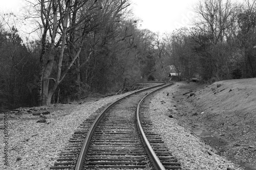 Obraz premium a single spooky train tracks leading into the distance in black and white