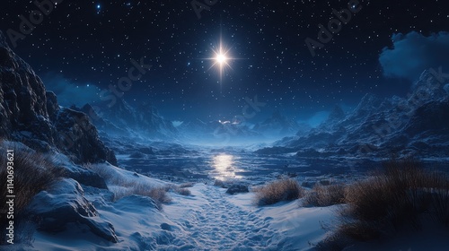 © That, Fototapeta premium A single star shining brightly in a night sky over a snowy landscape.