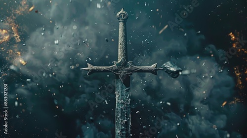 Naklejka premium A single sword suspended in mid-air against a dark and ominous background