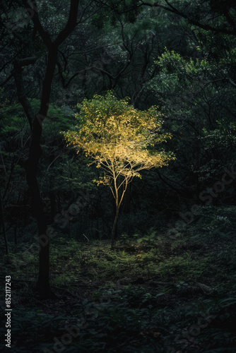 Naklejka premium A single tree glowing softly in a dark, dense forest, providing light and hope amidst the shadows, symbolizing optimism in difficult times.