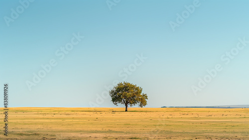 © mittpro, Obraz premium A single tree standing alone in a vast open field with a clear cloudless sky
