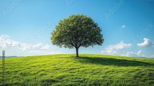 © Teerasak, Obraz premium A single tree standing alone in the middle of a vast green field under a clear blue sky