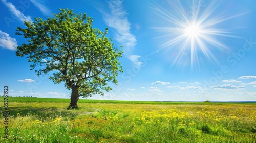 © BYAI, Obraz premium A Single Tree Standing in a Sunny Field of Wildflowers