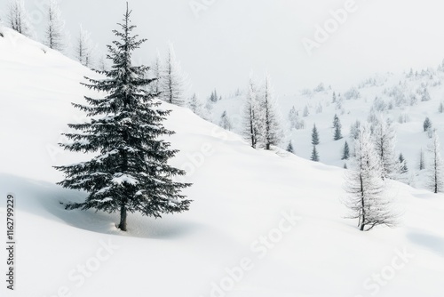 Fototapeta premium A single tree stands isolated in a snowy landscape