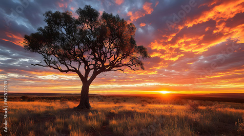 Fototapeta premium A Single Tree Stands Tall Against a Fiery Sunset, with Vivid Colors in the...