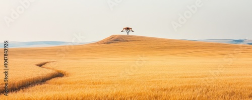 Obraz premium A single tree stands tall on a golden field, a winding path leading through...