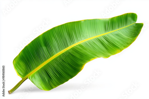Fototapeta premium A single, vibrant green banana leaf with a yellow vein, isolated on white.