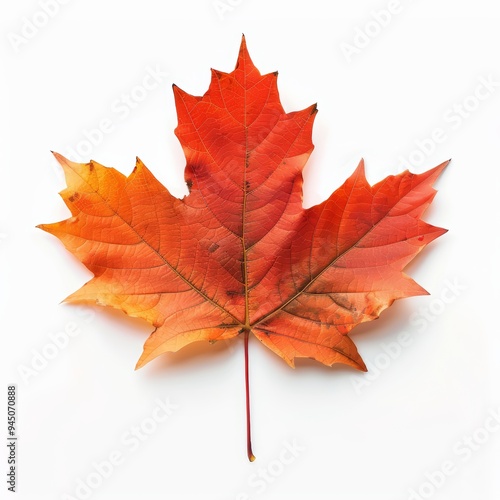 Fototapeta premium A single, vibrant red and orange maple leaf isolated on a white background.