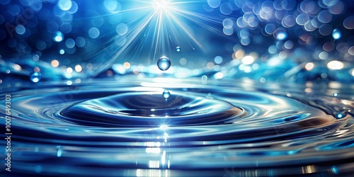 © Indigo Studio, Obraz premium A single water droplet creates a mesmerizing ripple pattern on a tranquil blue surface, illuminated by a celestial beam of light with scattered sparkles.