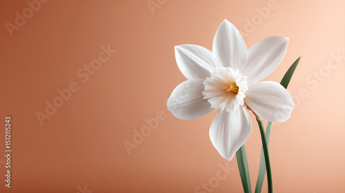 © ALA, Obraz premium A single white daffodil with delicate petals, centered on a soft pastel peach background for a minimalist touch