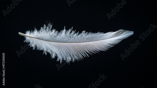 Obraz premium A single white feather floating against a black background.