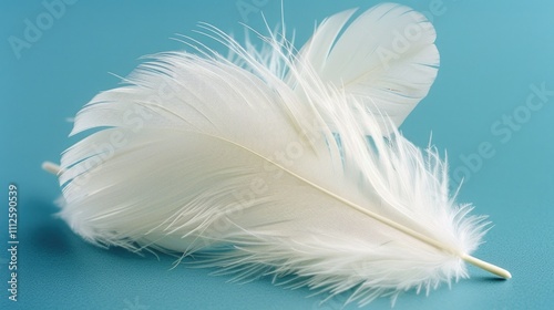 Obraz premium A single white feather lies on a blue surface, providing a subtle contrast of...