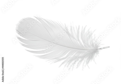 © Laki, Fototapeta premium A single white feather with delicate barbs isolated on a clean white background in soft focus