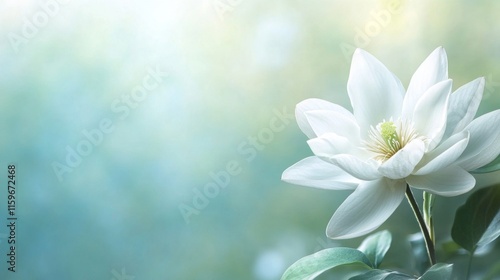 © IMAGINIAC, Obraz premium A Single White Flower Blooms Softly Against A Blurry Green Background