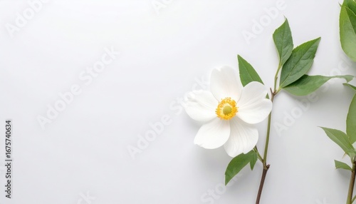 Obraz premium a single white flower with a yellow center and green leaves on a soft, light backdrop