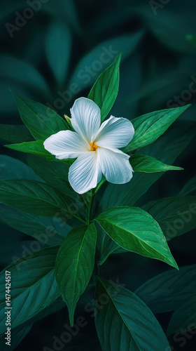 Fototapeta premium A single white flower with a yellow center blossoms amid lush green leaves in...