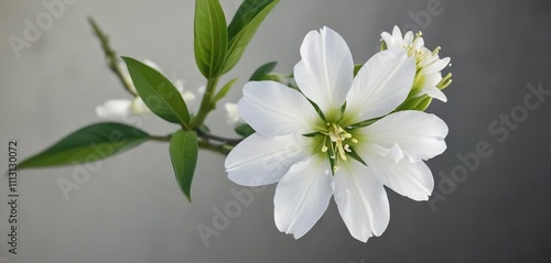 Fototapeta premium A single white jasmine flower unfurls its petals on a vibrant green stem, greenery, botanical, serene scene