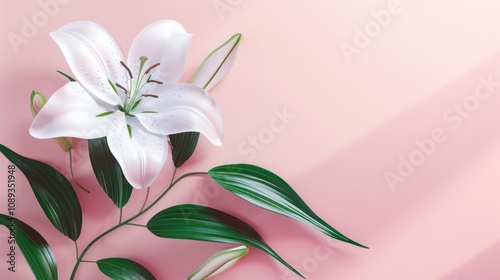 Fototapeta premium A single white lily with green leaves sits on a pale pink background.