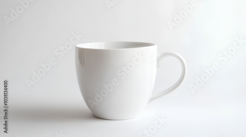 Fototapeta premium A single white mug with a rounded base and a handle sits on a plain white...