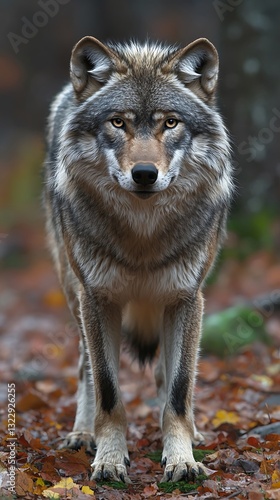 © lisa, Fototapeta premium A single wolf standing calmly and looking straight at the viewer