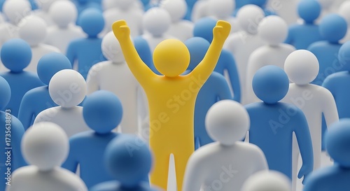 Fototapeta premium A single yellow figure stands out with arms raised in victory amidst a crowd of blue and white figures