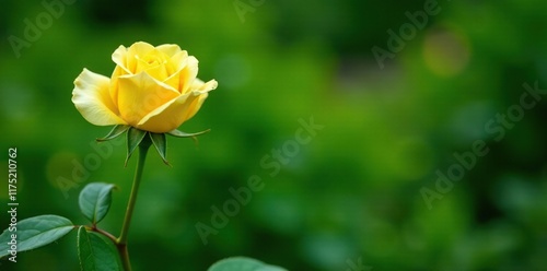 © Sutasinee, Naklejka premium A single yellow rose blooms against a backdrop of lush green foliage, garden, solitary