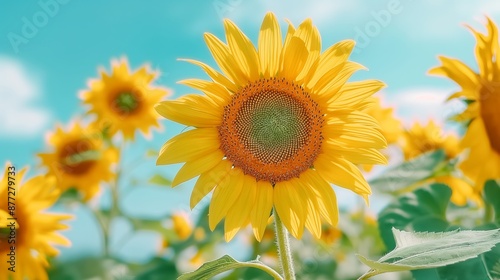 Fototapeta premium A single yellow sunflower is the center of a field of yellow flowers. The sunflower is surrounded by other sunflowers, creating a vibrant and cheerful scene