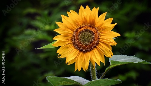 © Jaida, Fototapeta premium A Single Yellow Sunflower With Green Leaves In The Background