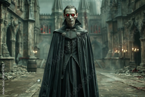 © Robert Anto, Naklejka premium A sinister vampire lord with glowing red eyes stands in a decrepit, gothic courtyard, exuding an aura of darkness and ancient power.