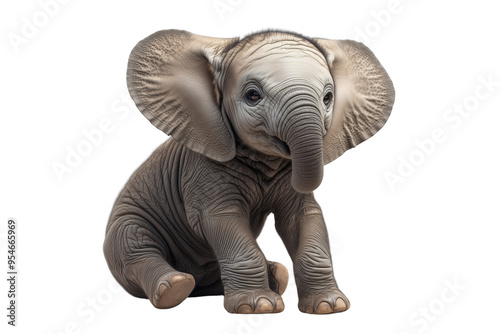 © Naem, Fototapeta premium A sitting baby elephant, isolated on a transparent background.