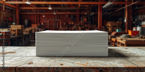 © MaeOnline, Obraz premium A sizable collection of bright white sheets sits prominently on a sturdy, aged workshop bench, ready for daily operations.