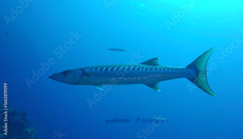 © isrofil, Obraz premium A sizable, streamlined fish, with a distinctive striped pattern, glides gracefully through the deep blue ocean.